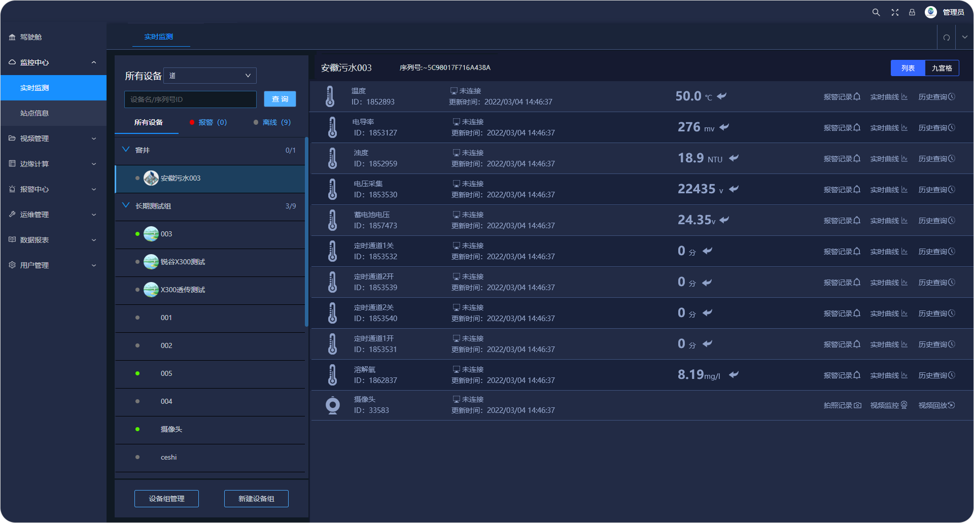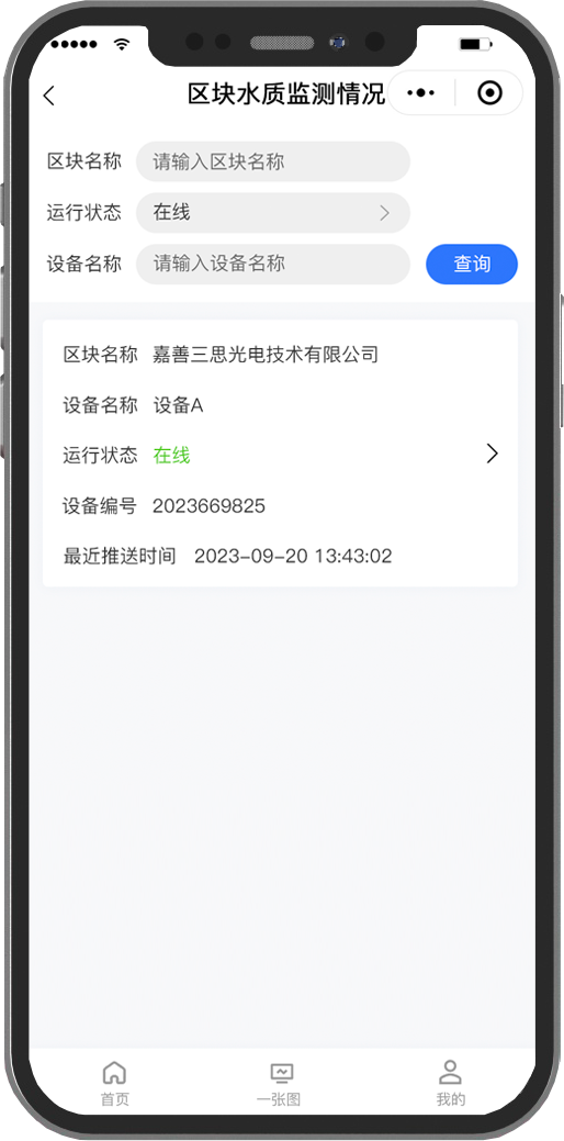 用戶可通過(guò)移動(dòng)端隨時(shí)查看設(shè)備運(yùn)行狀態(tài),并查看區(qū)塊水質(zhì)監(jiān)測(cè)數(shù)據(jù),實(shí)現(xiàn)遠(yuǎn)程監(jiān)控和管理。